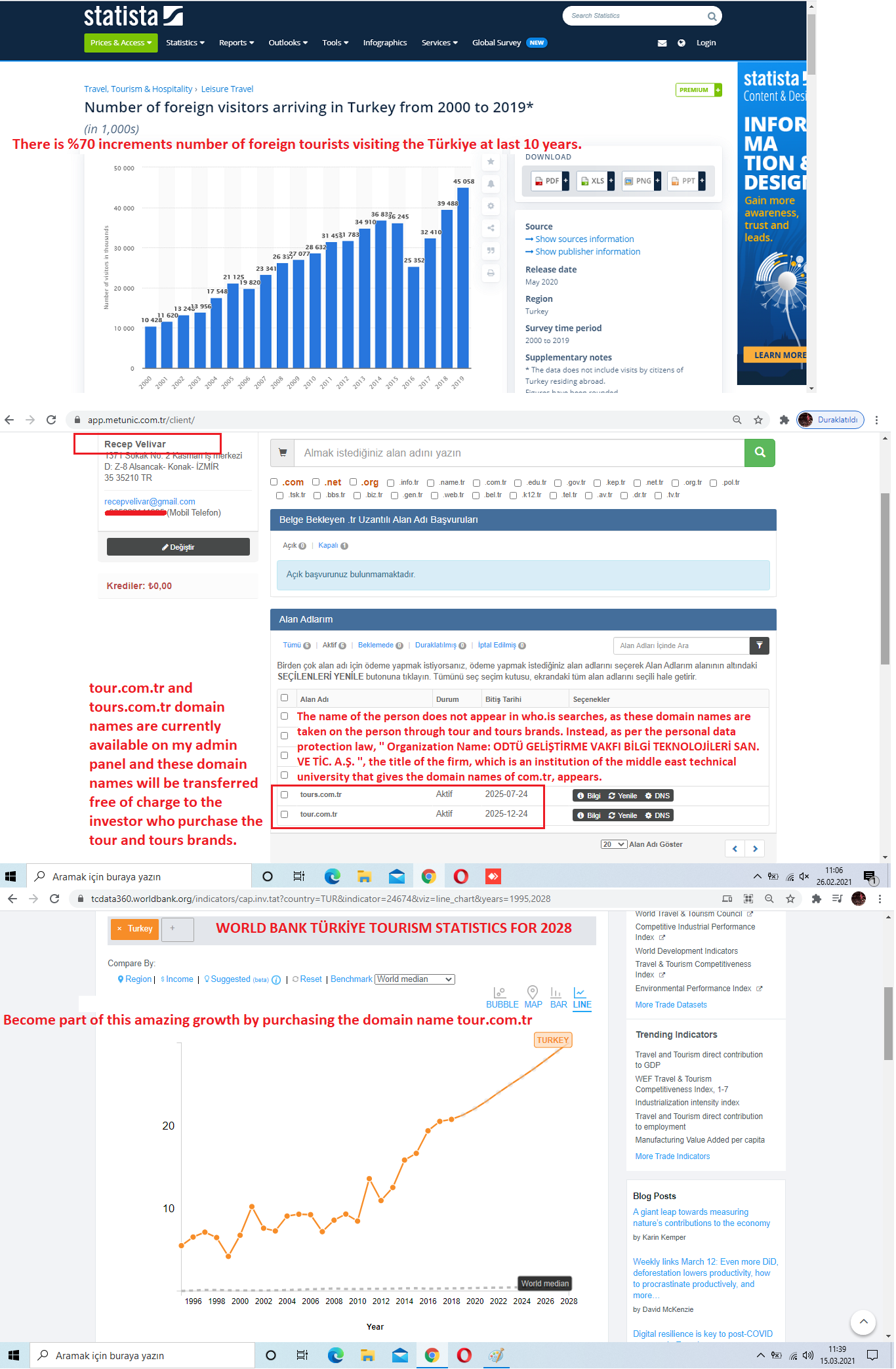 billion dollars a year over tour.com.tr domain name land and can earn 1-2 billion dollars in a year, between 10 to 20% commission rate. Between 30% and 50% of this income will be the net profit. So, if a very good team is established on the tour.com.tr domain name land, the annual net profit to be obtained from Turkish tourism can be between 300 million dollars and 1 billion dollars.
